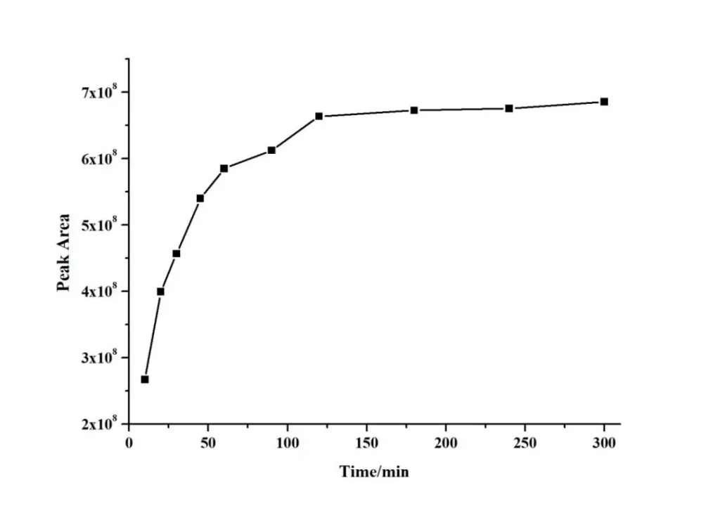 Ved å opprettholde en fast ekvilibreringstemperatur på 130 ℃ ble endringene i ekvilibreringstid fra 10 minutter til 300 minutter studert. Resultatene er vist i figur 2. Når ekvilibreringstiden når 120 minutter, har responsen en tendens til å stabilisere seg. Derfor velges en ekvilibreringstid på 120 minutter.